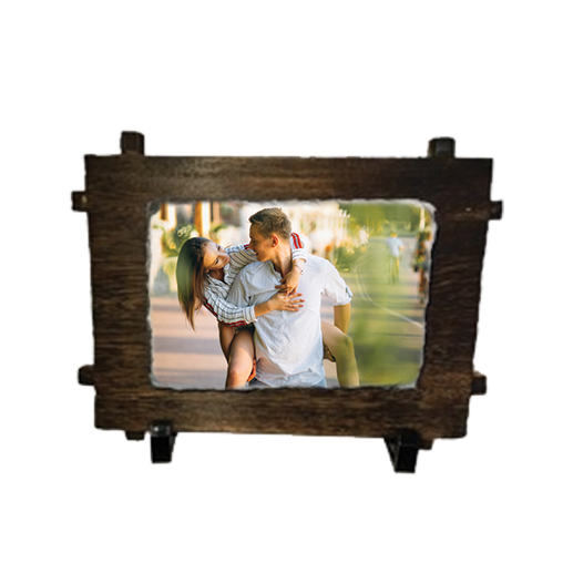 Placa de ardezie (10×15 cm) este imprimată prin sublimare și fixată pe un suport din lemn finisat (22×16 cm). Piciorușele de sprijin incluse permit o expunere stabilă, fiind ideală pentru birou, recepție sau casă.