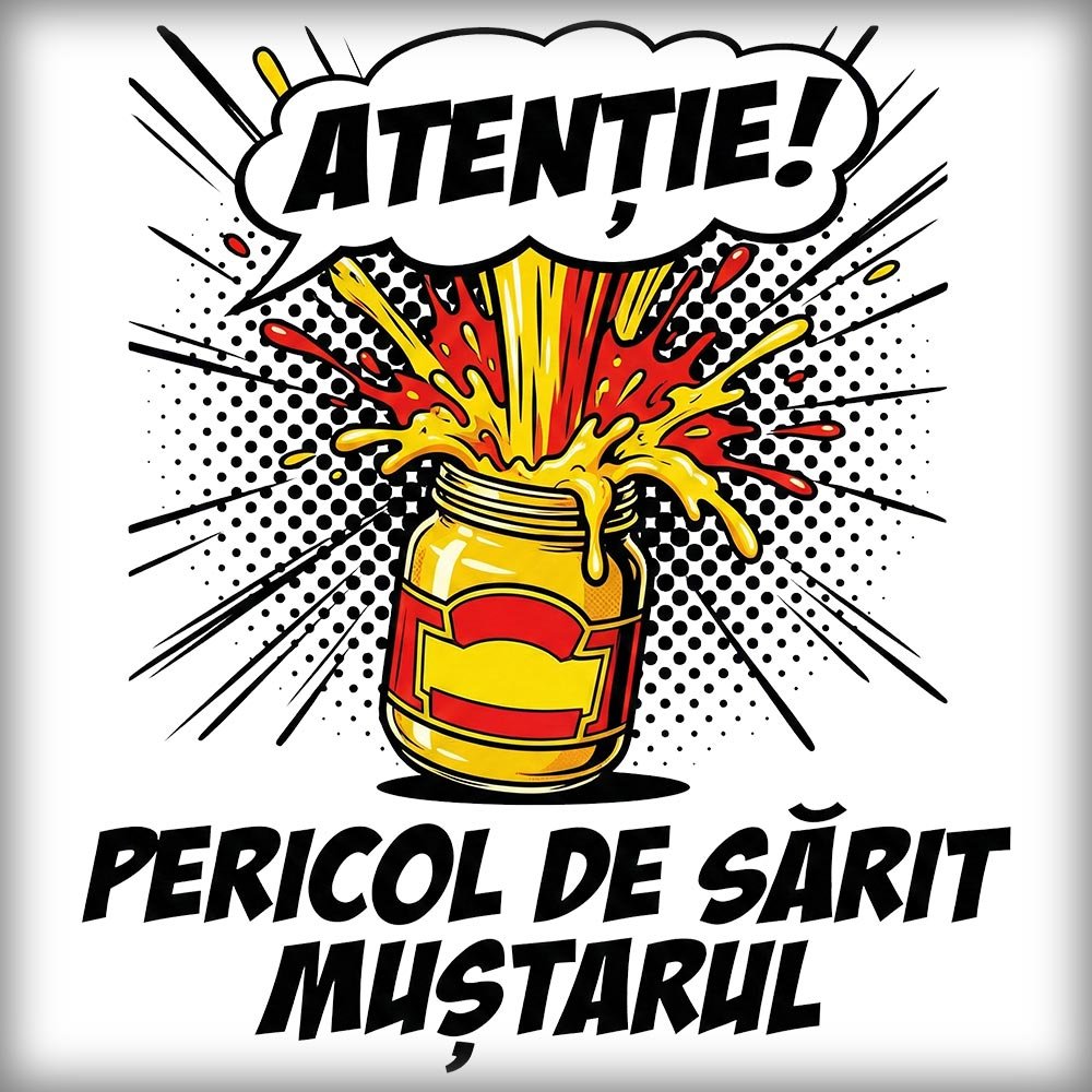 - Print: design „Pericol de Sărit Muștarul” cu ilustrație explozivă