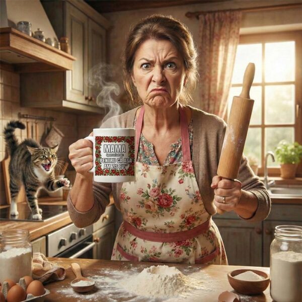 Cană Sponsored by… MAMA este o cană comică din ceramică ce recunoaște, cu umor și respect, cea mai mare autoritate din viața multora dintre noi: mama. Conceptul pornește de la cea mai celebră replică a mamelor din România — „Pentru că așa am zis eu!” — transformată într-un statement vizual memorabil.